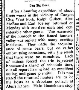 From a nearby part of the Interior, I found this in the Phoenix, BC “Pioneer” newspaper, 10-10-1908, page 1, about ‘the excursion of the nimrods’: