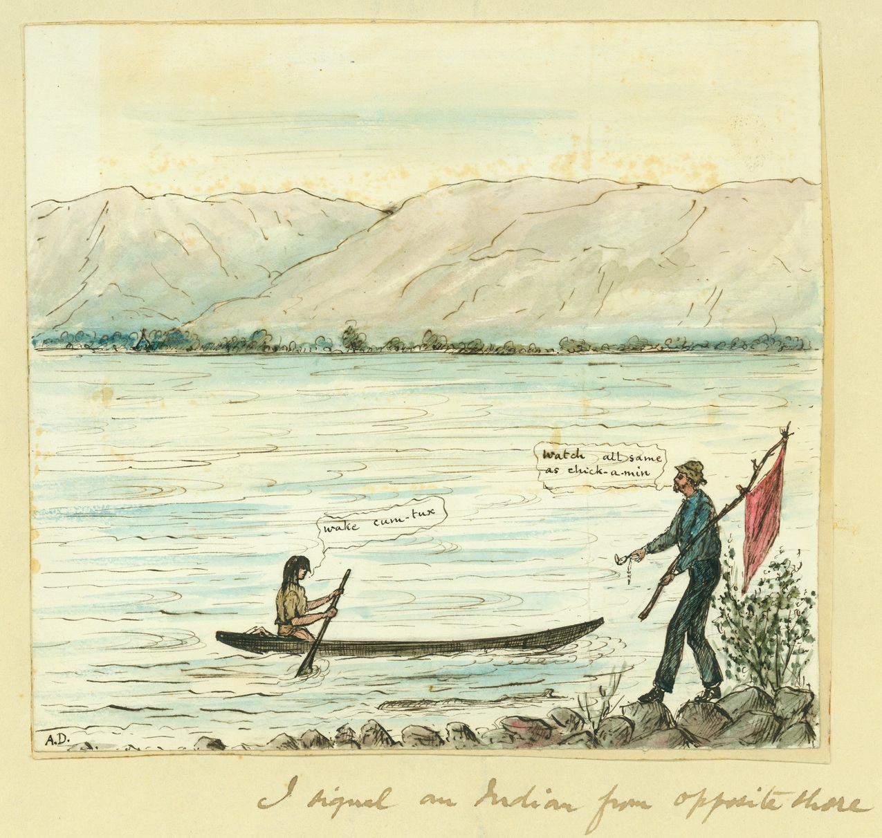 Jack reproduces three of Downing’s many sketches made in Moses-Columbia / Chelan country, while working as a ‘topographical assistant’ in the first half of the 1880s. One of these images piqued my interest; when I got hold of a larger copy of it, I found that the two figures are speaking Chinook Jargon to each other!