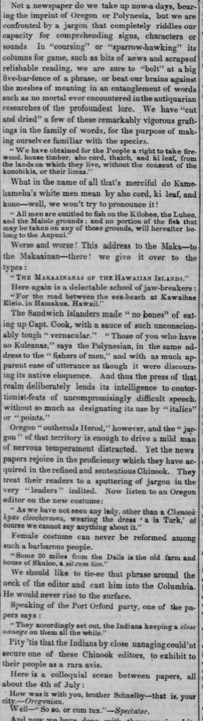 Not a newspaper do we take up now-a days, bearing the imprint of Oregon or Polynesia, but we are confronted by a jargon that completely riddles our capacity for comprehending signs, characters or sounds. In “coursing” or “sparrow-hawking” its columns for game, such as bits of news and scraps of relishable reading, we are sure to “‘bolt” at a big five-bar-fence of a phrase, or beat our brains against the meshes of meaning in an entanglement of words such as no mortal ever encountered in the antiquarian researches of the profoundest lore. We have “cut and dried” a few of these remarkably vigorous graftings in the family of words, for the purpose of making ourselves familiar with the species. “We have obtained for the People a right to take firewood, house timber, aho cord, thatch, and ki leaf, from the lands on which they live, without the consent of the konohikis, or their limas.” What in the name of all that’s merciful do Kamehameha’s white men mean by aho cord, ki leaf, and kono— well, we won’t try to pronounce it! “All men are entitled to fish on the Kilohee, the Luhee. and the Malolo grounds; and no portion of the fish that may be taken on any of those grounds, will hereafter belong to the Aupuni.” Worse and worse! This address to the Maka — to the Makaainan — there ! we give it over to the types: “THE MAKAAINANAS OF THE HAWAIIAN ISLANDS.” Here again is a delectable school of jaw-breakers: “For the road between the sea-beach at Kawaihae Eleio. in Hamakua. Hawaii.” The Sandwich Islanders made “no bones” of eating up Capt. Cook, with a sauce of such unconscionably tough “vernacular.” “Those of you who have no Kuleanas,” says the Polynesian, in the same address to the “fishers of men,” and with as much apparent ease of utterance as though it were discoursing its native eloquence. And thus the press of that realm deliberately lends its intelligence to contortionist-feats of uncompromisingly difficult speech, without so much as designating its use by “italics” or “points.” Oregon “outherods Herod,” however, and the “jargon” of that territory is enough to drive a mild man of nervous temperament distracted. Yet the news papers rejoice in the proficiency which they have acquired in the refined and sententious Chinook. They treat their readers to a sputtering of jargon in the very “leaders” indited. Now listen to an Oregon editor on the new costume: “As we have not seen any lady, other than a Chenook hyas cloocherman, wearing the’ dress ‘a la Turk,’ of course we cannot say anything about it.” Female costume can never be reformed among such a barbarous people. “Some 20 miles from the Dalls is the old farm and home of Skuloo, a sit cum tiee” We should like to tie-ee that phrase around the neck of the editor and cast him into the Columbia. He would never rise to the surface. Speaking of the Port Orford party, one of the papers says: “They accordingly set out, the Indians keeping a close nanage on them all the while.” Pity ’tis that the Indians by close nanaging could’nt secure one of these Chinook editors, to exhibit to their people as a rara avis. Here is a colloquial scene between papers, all about the 4th of July : How was it with you, brother Schnelby— that is, your city. — Oregonian. Well — “So so. or cum tux.” — Spectator.