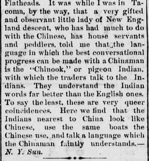 From an 1887 article titled “Siwash potlatches”, a novel theory of why Chinese immigrants speak Chinook Jargon: It was while I was in Ta- coma, by the way, that a very gifted and… Continue reading