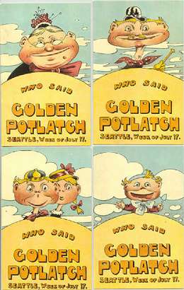 They traveled the West Coast to promote their summer festival. In San Francisco the newspapermen said “Klahowya Six! to the Potlatch Bug / City extends hyas skookum Chinook welcome to Seattle carnival tyees“.
