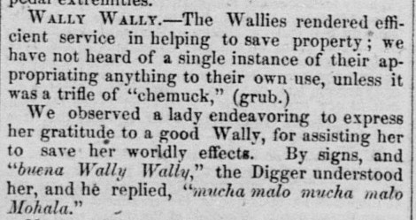 More substantial, though, is a quotation of a Native man in the gold-rush town of Columbia, CA (Sacramento Daily Union, Volume 13, Number 2005, 29 August 1857, page 3, article “Conflagration at Columbia“). I’m going to find it a new habit to introduce every mention of Aboriginals in old California newspapers with a sort of trigger warning, because they’re typically extremely racist, like the following: