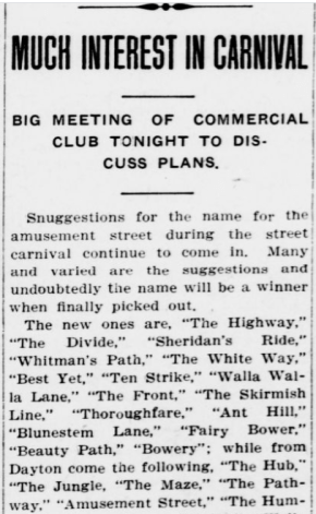 “Snuggestions” (!) for the name of a post-frontier Walla Walla carnival’s “main street” included several in Chinuk Wawa…