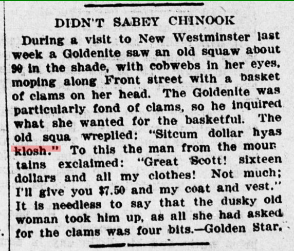 During a visit to New Westminster last week a Goldenite [from Golden, BC, in the East Kootenays] saw an old squaw about 99 in the shade, with cobwebs in her eyes, moping along Front street with a basket of clams on her heads. The Goldenite was particularly fond of clams, so he inquired what she wanted for the basketful. The old squaw replied: “SItcum dollar hyas klosh.” To this the man from the mountains exclaimed: “Great Scott! sixteen dollars and all my clothes! Not much; I’ll give you $7.50 and my coat and vest.” It is needless to say that the dusky old woman took him up, as all she had asked for the clams was four bits. — Golden Star