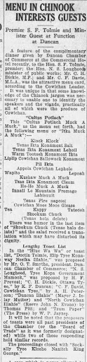 In the “Hiue Wa Wa” or toast list, “Doctin Tolmie, Elip Tyee Konaway Nesika Illahee,” was proposed by Mr. O.T. Smythe, president, Duncan Chamber of Commerce; “N.S. Lougheed, Tyee Kopa Government Mamook,” was proposed by H.F. Provost; “C.H. Deckie, Ottawa Tyee,” by K.F. Duncan; “C.F. Davie, Cowichan Tyee,” by A.H. Peterson; “Duncan Illahie” (Mayor Z. Islay Miller) and “North Cowichan Illahie” (Reeve John N. Evans) by Thomas Pitt; and “Tsum Paper” (The Press) by W.P. Jayacq.