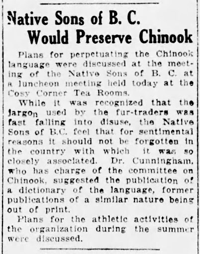 While it was recognized that the jargon used by the fur-traders was fast falling into disuse, the Native Sons of B.C. feel that for sentimental reasons it should not be forgotten in the country with which it was so closely associated. Dr. Cunningham, who has charge of the committee on Chinook, suggested the publication of a dictionary of the language, former publications of a similar nature being out of print.