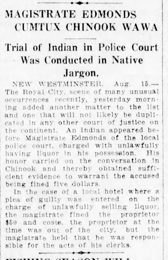 The Royal City, scene of many unusual occurrences recently, yesterday morning added another matter to the list and one that will not likely be duplicated in any other court of justice on the continent. An Indian appeared before Magistrate Edmonds of the local police court, charged with unlawfully having liquor in his possession. His honor carried on the conversation in Chinook and thereby obtained sufficient evidence to warrant the accused being fined five dollars.