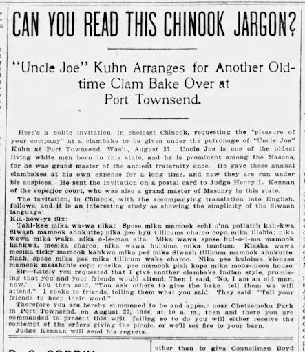 Here’s a polite invitation, in choicest Chinook, requesting the “pleasure of your company” at a clambake to be given under the patronage of “Uncle Joe” Kuhn at Port Townsend, Wash., August 27. Uncle Joe is one of the oldest living white men born in this state, and he is prominent among the Masons, for he was grand master of the ancient fraternity once. He gave these annual clambakes at his own expense for a long time, and now they are run under his auspices. He sent the invitation on a postal card to Judge Henry L. Kennan of the superior court, who was also a grand master of Masonry in this state.