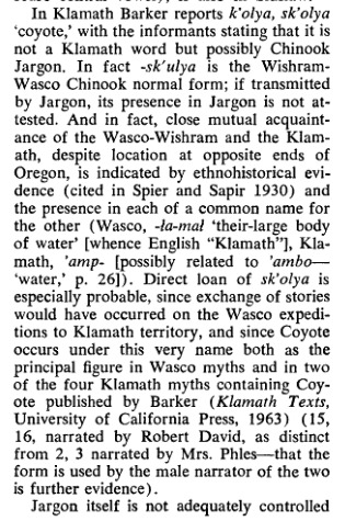 In Klamath Barker reports k’olya, sk’olya ‘coyote,’ with the informants stating that it is not a Klamath word but possibly Chinook Jargon. In fact -sk’ulya is the Wishram-Wasco [Kiksht] Chinook normal form; if transmitted by Jargon, its presence in Jargon is not attested. And in fact, close mutual acquaintance of the Wasco-Wishram and the Klamath, despite location at opposite ends of Oregon, is indicated by ethnohistorical evidence (cited in Spier and Sapir 1930) and the presence in each of a common name for the other (Wasco, -ɬa-maɬ ‘their-large body of water’ [when English “Klamath”], Klamath, ‘amp- [possibly related to ‘ambo — ‘water,’ p. 26). Direct loan of sk’olya is especially probable, since exchange of stories would have occurred on the Wasco expeditions to Klamath territory, and since Coyote occurs under this very name both as the principal figure in Wasco myths and in two of the four Klamath myths containing Coyote published by Barker (Klamath Texts, University of California Press, 1963) (15, 16, narrated by Peter David, as distinct from 2, 3 narrated by Mrs. Phles — that the form is used by the male narrator of the two is further evidence).
