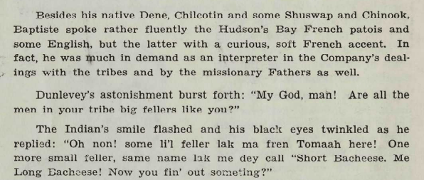 Besides his native Dene, Chilcotin and some Shuswap and Chinook, Baptiste spoke rather fluently the Hudson’s Bay French patois and some English, but the latter with a curious, soft French accent. In fact, he was much in demand as an interpreter in the Company’s dealings with the tribes and by the missionary Fathers as well…