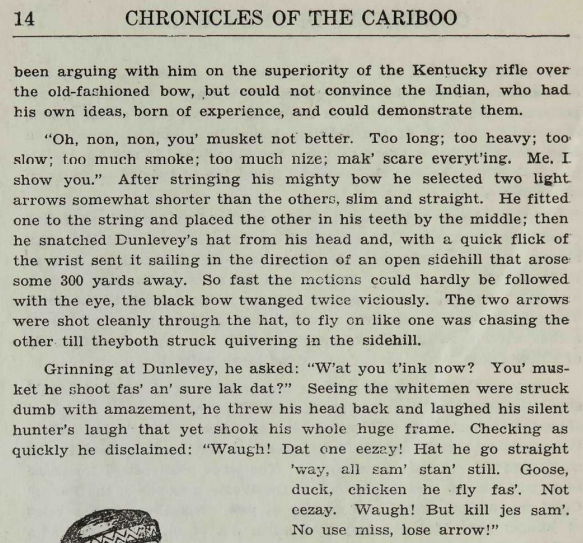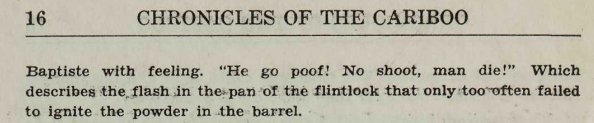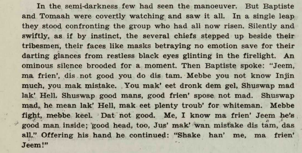 This book also presents several originally Chinook Jargon utterances, mostly transformed into a blend of CJ and English that’s meant to ease the reader’s way. I won’t focus on those here, but they’re interesting for their resembling Cariboo CJ’s otherwise known incorporation of a few local Salish words. Read the book at the link above.