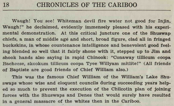 One of the major First Nations personalities in Dunlevey’s reminiscences is Tomaah, a son of a Secwépemc chief; that’s “Shuswap” Salish people. Chief William of the northern Secwépemc is also remembered, and he’s the person who modern Williams Lake, BC is named for. There’s also a tribal woman and her daughters from the Soda Creek area. These folks are largely represented as talking Chinook Jargon as I’ve just described.