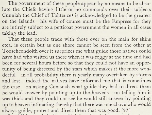 That these people trade with those over on the main for skins etca. is certain but as one shore cannot be seen from the other at Tooschcondolth over it surprizes me what guide those natives could have had who visited us there when it was foggy at the time and had been for several hours before so that they could not have an opportunity of being directed by the stars which makes it the more wonderful in all probability there is yearly many overtaken by storms and lost indeed the natives have informed me that is sometimes the case on asking Comsuah what guide they had to direct them he would answer by pointing up to the heavens on telling him it was thick and they could not see he would still answer by pointing up to heaven intimating thereby that there was one above who would always guide, protect and direct them that was good.