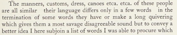 The manners, customs, dress, canoes etca. etca. of these people are all similar their language differs only in a few words in the termination of some words they have or make a long quivering which gives them a most savage disagreeable sound but to convey a better idea I here subjoin a list of words I was able to procure which are spelt as near to their pronunciation as my ear would direct which I am conscious is far from being right.