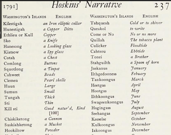 Page 245 at Archawat in Makah country on the modern USA side of the Straits of Juan de Fuca, September 1791 — a somewhat involved narrative from a chief who has had substantial dealings with the Spaniards, and is able to sing Christian songs in “broken Spanish and Indian”, the latter perhaps resembling the couple of seemingly Nootka Jargon song lyrics we know to have been composed by Spanish & English-speaking visitors — but Hoskins is not confident he understands this man: