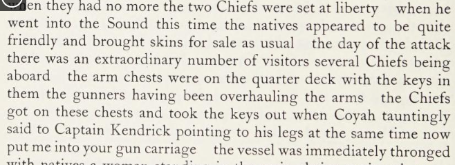 …the two Chiefs were set at liberty when he went into the Sound this time the natives appeared to be quite friendly and brought skins for sale as usual the day of the attack there was an extraordinary number of visitors several Chiefs being aboard the arm chests were on the quarter deck with the keys in them the gunners having been overhauling the arms the Chiefs got on these chests and took the keys out when Coyah tauntingly said to Captain Kendrick pointing to his legs at the same time now put me into your gun carriage