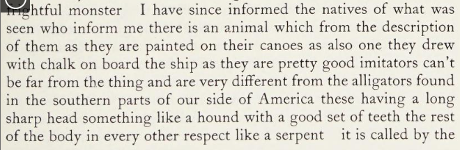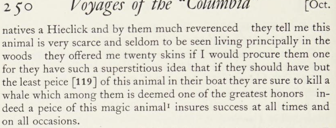 I have since informed the natives of what was seen who inform me there is an animal which from the description of them as they are painted on their canoes as also one they drew with chalk on board the ship as they are pretty good imitators can’t be far from the thing and are very different from the alligators found in the southern parts of our side of America these having a long sharp head something like a hound with a good set of teeth the rest of the body in every respect like a serpent it is called by the natives a Hieclick and by them very much reverenced they tell me this animal is very scarce and seldom to be seen living principally in the woods they offered me twenty skins if I would procure them one for they have such a superstitious idea that if they should have but the least peice of this animal in their boat they are sure to kill a whale which among them is deemed one of the greatest honors indeed a peice of this magic animal insures success at all times and on all occasions.