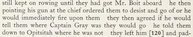 he then pointing his gun at the chief ordered them to desist and go of or he would immediately fire upon them they then agreed if he would tell them where Captain Gray was they would go he told them down to Opitsitah where he was not they left him…