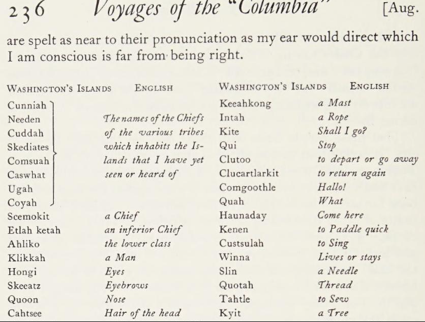 On page 226, with these same Northern Haidas, it’s accurately recognized that “Their language and dress is very similar to what we have heard and seen at Washington’s Islands…” [Haida Gwaii]. This level of linguistic sophistication, at least, is constant through the earliest Euro-American journals. The newcomers typically were able to tell which languages were greatly dissimilar or unrelated to each other.