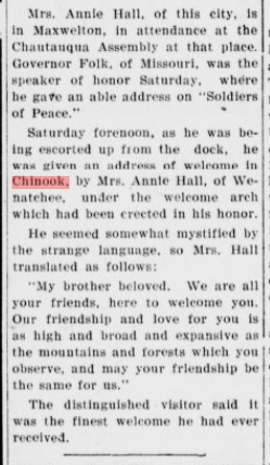 Saturday afternoon, as he was being escorted up from the dock, he was given an address of welcome in Chinook, by Mrs. Annie Hall, of Wenatchee, under the welcome arch which had been erected in his honor.