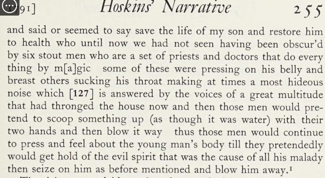 Pages 254-255, on December 22, 1791, visiting a sick man who is being treated by the traditional Pacific Northwest curing method whereby a medicine man sucks at the afflicted area of one’s body (thus my etymology of Chinuk Wawa’s t’əmánəwas ‘spirit power’ as coming from Coast Salish t’əm ‘sucking’ -á ‘at’ -nəwas ‘the body’):