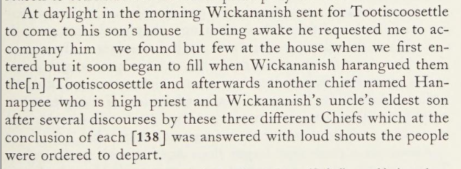 At daylight in the morning Wickananish sent for Tootiscoosettle to come to his son’s house I being awake he requested me to accompany him we found but few at the house when we first entered but it soon began to fill when Wickananish harangued them the[n] Tootiscoosettle and afterwards another chief named Hannappee who is high priest and Wickananish’s uncle’s eldest son after several discourses by these three different Chiefs which at the conclusion of each was answered with loud shouts the people were ordered to depart.