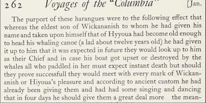 The purport of these harangues were to the following effect that whereas the eldest son of Wickananish to whom he had given his name and taken upon himself that of Hyyoua had become old enough to head his whaling canoe (a lad about twelve years old) he had given it up to him that it was expected in future they would look up to him as their Chief and in case his boat got upset or destroyed by the whales all who paddled in her must expect instant death but should they prove successfull they would meet with every mark of Wickananish or Hiyoua’s pleasure and according to ancient custom he had already been giving them and had had some singing and dancing that in four days he should give them a great deal more the meantime they must dedicate to mirth and festivity.