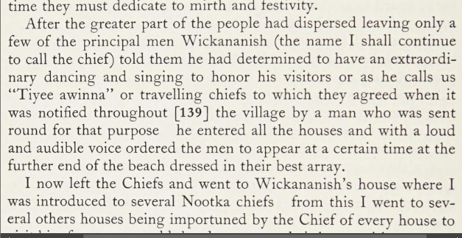 After the greater part of the people had dispersed leaving only a few of the principal men Wickananish (the name I shall continue to call the chief) told them he had determined to have an extraordinary dancing and singing to honor his visitors or as he calls us “Tiyee awinna” or travelling chiefs to which they agreed when it was notified throughout the village by a man who was sent round for that purpose he entered all the houses and with a loud and audible voice ordered the men to appear at a certain time at the further end of the beach dressed in their best array.