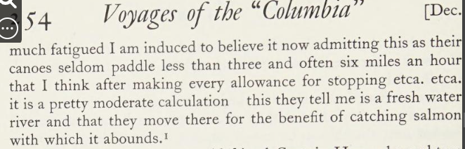 Having frequently expressed to the Chiefs my wish to visit their village of Okerminna which they as frequently told me was not navigable for such boats as ours it being situated at the head of a long narrow river which was obstructed by several bad falls at some they were obliged to land walk over and take canoes on the opposite side at others they must watch the tides and go over with the greatest care notwithstanding which their canoes often got upset and the people were drownded but that they would bring a canoe on purpose for me finding this was only done to amuse [humor] me and that they did not intend I should visit their village I became the more curious and desirous of going Tootoocheetticus being abord to day I insisted on going with him in his canoe he made a variety of objections such as the distance dangers and the like he finding I determined to surmount every difficulty he should throw in the way finally told me he was not a going home but going to some other village from these circumstances and being advised to no longer persist in what might prove fatal to me I now gave up all hopes of ever seeing this village but from the best information I could collect from the natives must be at least forty or fifty miles distance from the ship for they tell me they leave the village in the afternoon and arrive at the ship in the forenoon of the following day they also tell me they paddle all night and as they generally appear to be much fatigued I am induced to believe it now admitting this as their canoes seldom paddle less than three and often six miles an hour that I think after making every allowance for stopping etca. etca. it is a pretty moderate calculation this they tell me is a fresh water river and that they move there for the benefit of catching salmon with which it abounds.