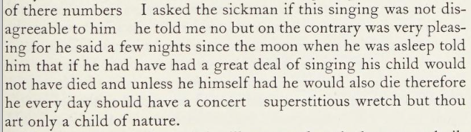 I asked the sickman if this singing was not disagreeable to him he told me no but on the contrary was very pleasing for he said a few night since the moon when he was asleep told him that if he had have had a great deal of singing his child would not have died and unless he himself had he would also die therefore he every day should have a concert superstitious wretch but thou art only a child of nature.