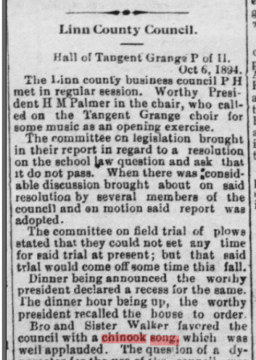 An Oregon “grange” meeting featured dinner entertainment in Chinuk Wawa, just after the frontier era, not far from Grand Ronde.