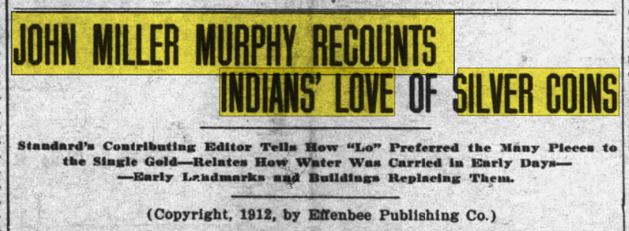 — “John Miller Murphy Recounts Indians’ Love of Silver Coins“, Olympia (WA) Washington Standard of August 23, 1912, page 1, columns 3-4
