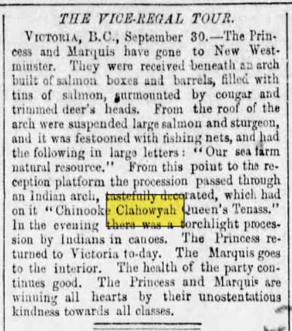 Well, here’s the news from 1882, with a “Chinook welcome (to the) queen’s child.” —