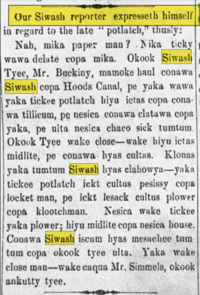 A few years into the post-frontier era, we have a “local colour” newspaper piece in Vancouver, British Columbia, that relies on Chinook Jargon for some humour.