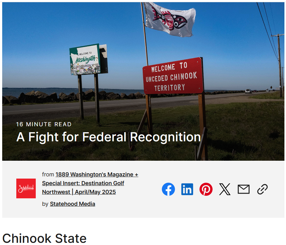 I like how the magazine features the phrase “Chinook State” and quotes Chinook Nation vice-chairman Sam Robinson reminding folks that Washington was originally called that.