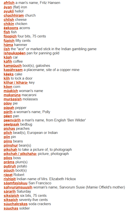 A wonderful feature of it is that you can toggle a search for “Semantic Domain: loanwords“, and see what kind of stuff this Northwest California Indigenous language isolate has historically borrowed from other languages.