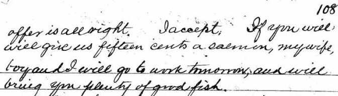 ‘…if you do good work for me, and have your own canoe…’ Nika tumtum mika iskum tahtlum hias samun konaway sun. …but I will expect at least ten big salmon every day.