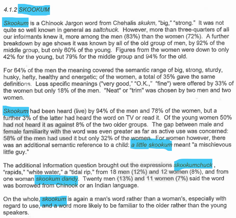 I’m personally fascinated by the one woman’s contribution of a phrase, calling a mischievous kid “a little skookum“. This shows the survival of the other meaning this word has in CJ, “a dangerous being”, as Melville Jacobs put it.