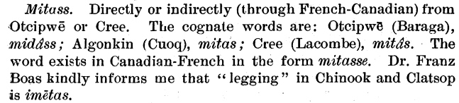 For one of those words, which we know from the phenomenal 2012 Chinuk Wawa dictionary of the Grand Ronde Tribes as mítás ‘leggings’, Chamberlain’s article tells us (p.261):
