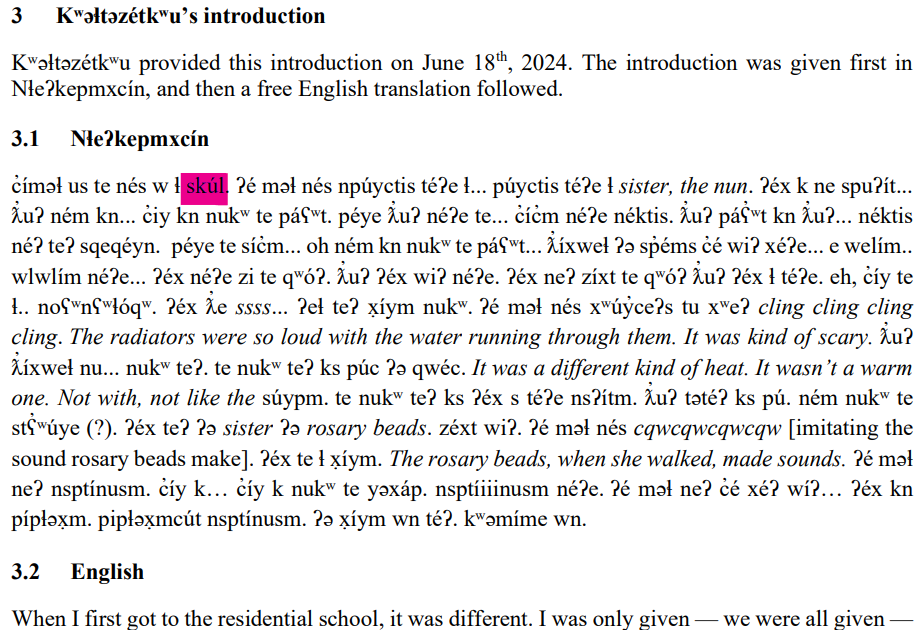 Realizing this through the years has also led me to understand that the loaned noun skul, taken into BC Indigenous languages from Chinook Jargon (as well as from English), primarily meant “residential school” in that era.