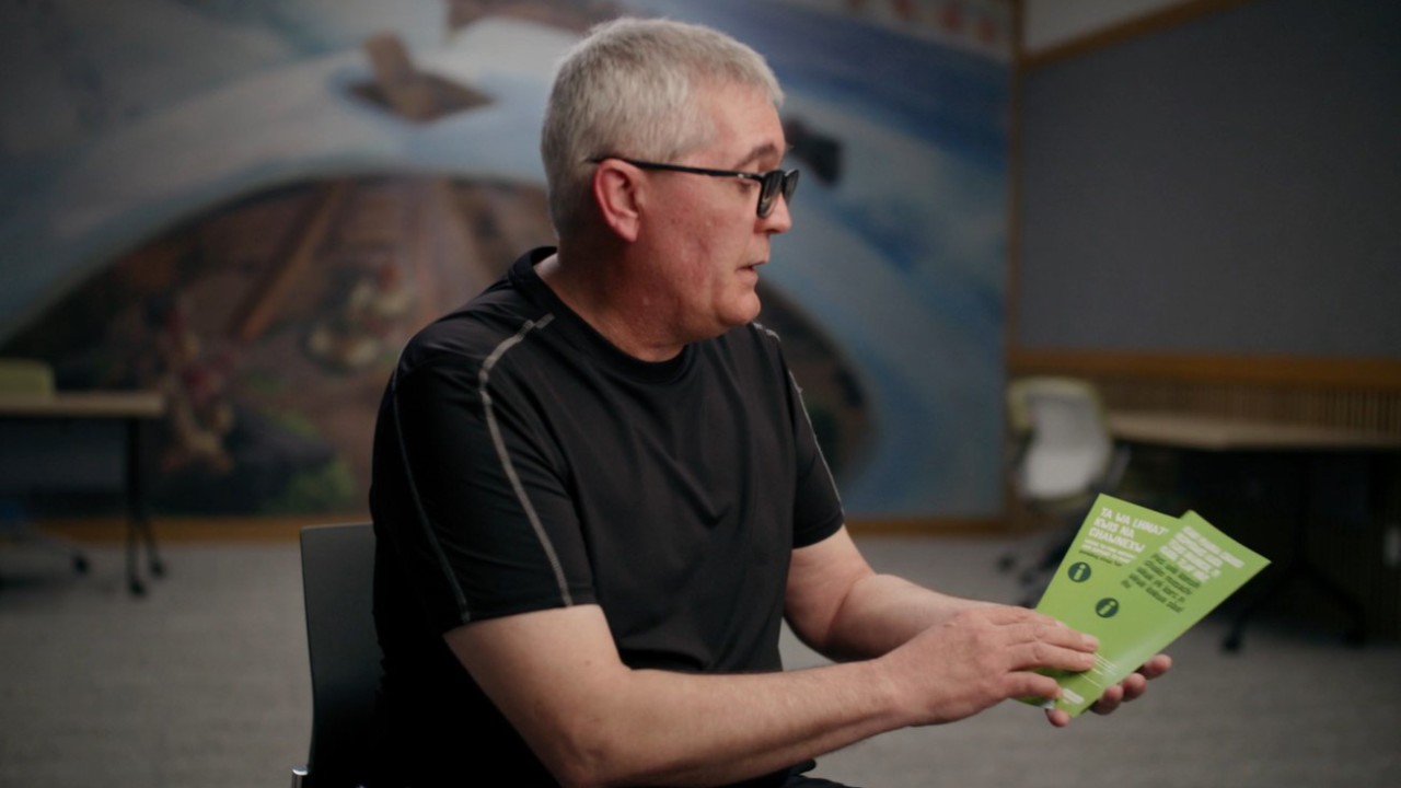 Here, Darrin’s holding BCLC’s GameSense brochure in Chinook Jargon and in Skwxwú7mesh Sníchim.