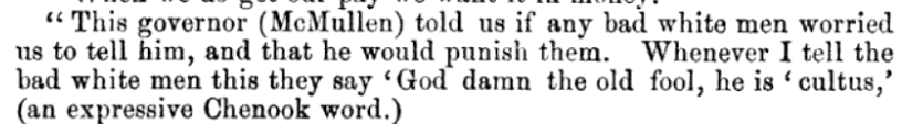 On pages 576-588, you’ll find #81 from Puget’s Sound District, by M[ichael] T. Simmons, Indian Agent. This report is so voluminous because it contains an extremely precious resource, lengthy quotations of Indigenous people’s sentiments (e.g. “Hiram, a Skokomish” and “Bonaparte, a Snohomish chief”) in English but clearly back-translatable to Chinook Jargon, a language Simmons used with great fluency. Those folks make clear their wish to retain hunting & fishing rights, etc. Explicit evidence of CJ includes the use of words such as “the Wood or Stick” Indians; “Custis Bostons” (i.e. kʰə́ltəs bástən-s); and this on page 581, reinforcing my constant claim that Chinuk Wawa knowledge and use of English cussin’ went hand in hand: