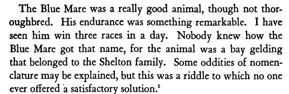 The Blue Mare was a really good animal, though not thoroughbred. His endurance was something remarkable. I have seen him win three races in a day. Nobody knew how the Blue Mare got that name, for the animal was a bay gelding that belonged to the Shelton family. Some oddities of nomenclature may be explained, but this was a riddle to which no one ever offered a satisfactory solution. 1