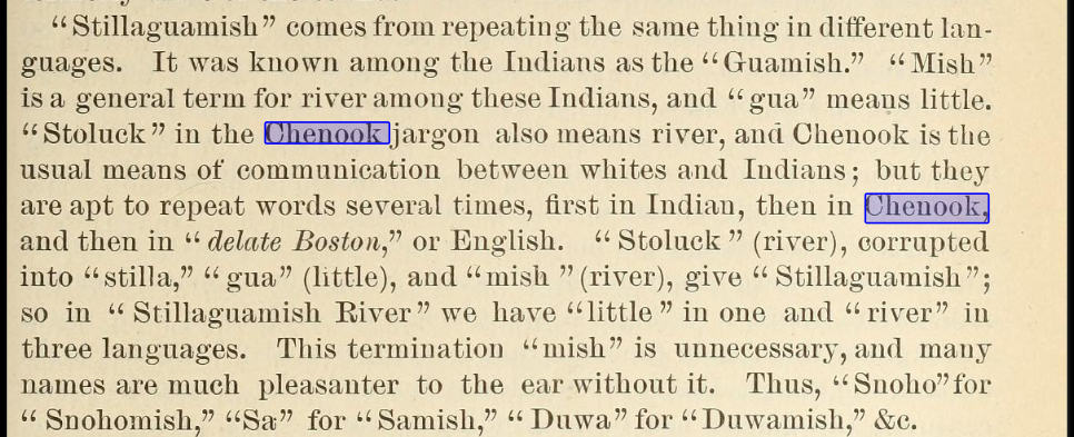 “Stillaguamish” comes from repeating the same thing in different languages. It was known among the Indians as the “Guamish.” “Mish” is a general term for river among these Indians, and “gua” means little. “Stoluck” in the Chenook jargon also means river, and Chenook is the usual means of communication between whites and Indians; but they are apt to repeat words several times, first in Indian, then in Chenook, and then in “delate Boston,” or English. “Stoluck” (river), corrupted into “stilla,” “gua” (little), and “mish “(river), give “Stillaguamish“; so in “Stillaguamish River” we have “little ” in one and “river” in three languages. This termination “mish” is unnecessary, and many names are much pleasanter to the ear without it. Thus, [the fictitious names!] “Snoho“for “Snohomish,” “Sa” for “Samish,” “Duwa” for “Duwamish,” &c.