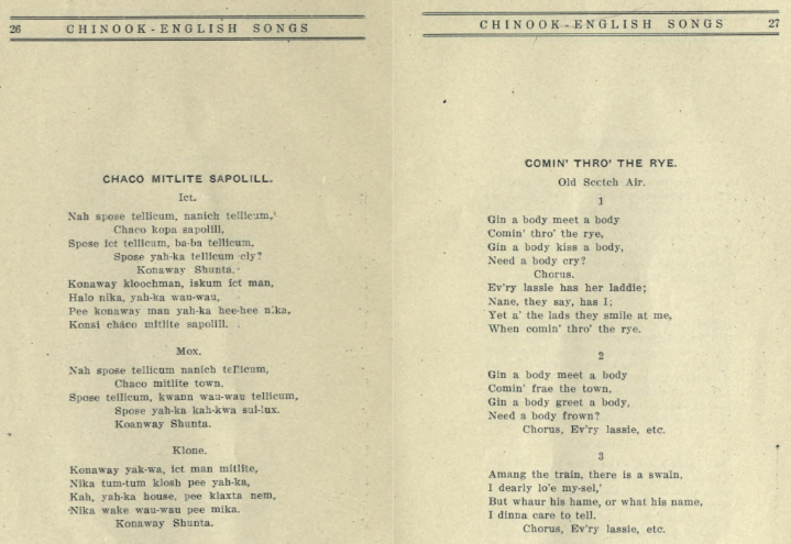 1914: LBDB’s “Chinook-English Songs”, part 8 of 15 “Chaco Mitlite Sapolill” (Comin’ Thro’ the Rye)
