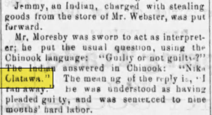 Mr. Moresby was sworn to act as interpreter; he put the usual question, using the Cbinook language: “Guilty or not guilty?” The Indian answered in Chinook: “Nika Clatawa.” The meaning of the reply is, “I ran away.” He was understood as having pleaded guity, and was sentenced to nine months’ hard labor.