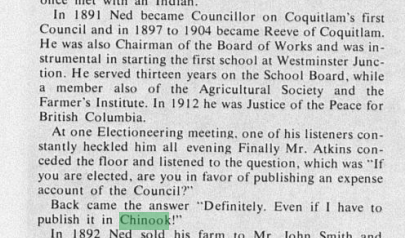 From Alex Code, I received this anecdote of Ned Atkins in the book “The History of Port Coquitlam” by Edith Chambers [1973].