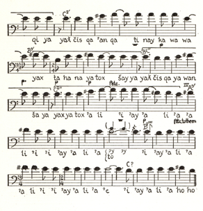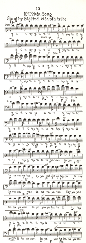Today I’ll present this other one, song #10 from pages 235-236 in “Songs of the Nootka Indians of Western Vancouver Island” by Helen H. Roberts and Morris Swadesh (Transactions of the American Philosophical Society, New Series, Volume 45, Part 3, 1955).