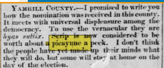 YAMHILL COUNTY .- I promised to write you how the nomination was received in this county. It meets with universal displeasure among the democracy. To use the vernacular they are hyas sullix. [hayas-sáliks ‘very angry’.] Scrip is now considered to be worth about a picayune a peck. I don’t think the people have yet made up their minds what they will do, but some will stay at home on the day of the election.
