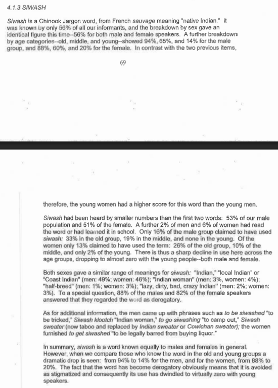 age groups, dropping to almost zero with the young people — both male and female.Both sexes gave a similar range of meanings for siwash: “Indian,” “local Indian” or